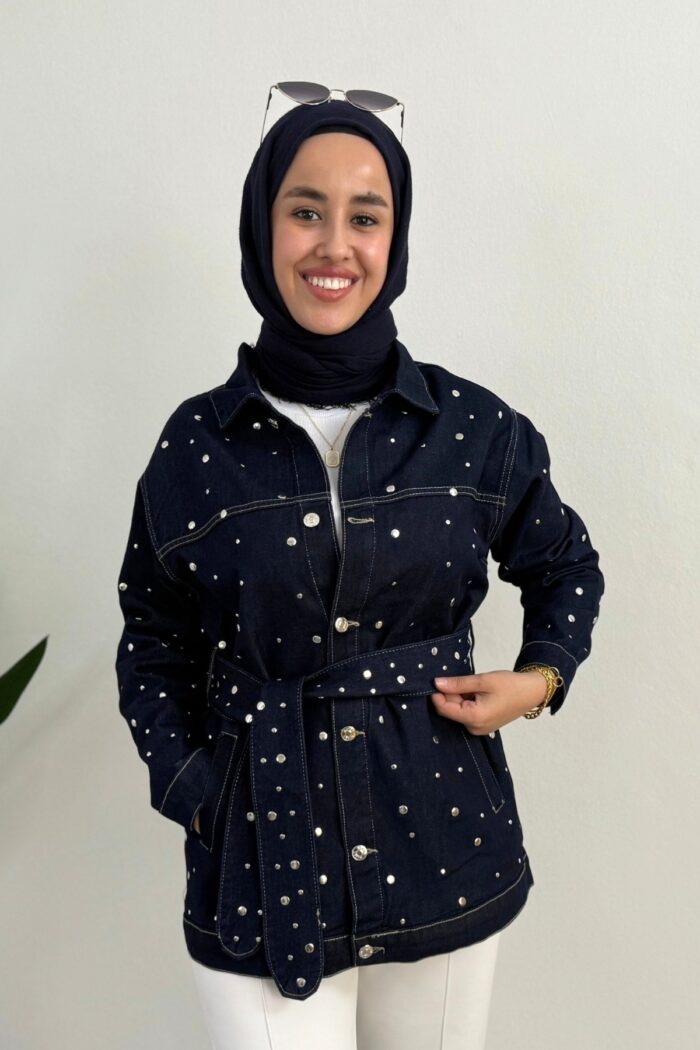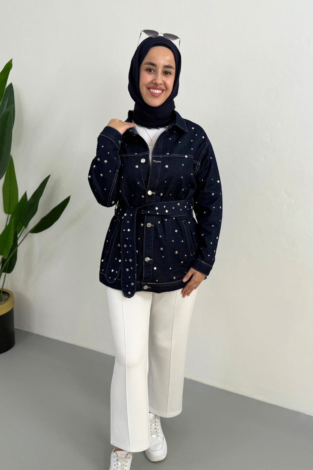 Zımbalı Kemerli Kot Ceket-Lacivert