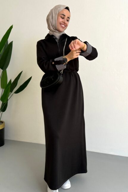 Kemerli Gömlek Yaka Detaylı Çizgili Elbise-Siyah